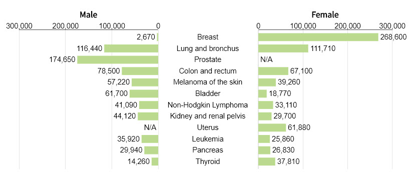 The figure below shows the types of cancer and how common they are. These numbers are estimates for 2019.
