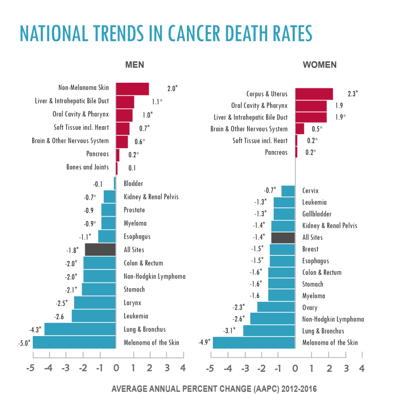 The National Cancer Institute has been tracking cancer statistics for our country for decades. The two stats that most people care about are cancer incidence and cancer deaths. Cancer incidence is the number of new cases each year. Cancer deaths is self-explanatory (the number of deaths from cancer each year). Both of these figures have been declining overall. It’s true that if you look closely and break things down, certains cancer types are occuring slightly more frequently, but more are becoming less frequent. Below is a figure showing the breakdown. It is important to note that this figure comes from recent years (2012-2016), which makes the trend more relevant to today. The blue color denotes cancer types that have declining death rates. The size of the bar corresponds to the size of the decline. The brick red bars represent the cancer types that have been on the rise. Repeat, the size of the bar does not represent the number of people with that type of cancer; the size of the bar corresponds to how much the death rate from that cancer type has changed from the prior year. As you can see, overall, cancer deaths are going down. The glass isn’t always half empty.